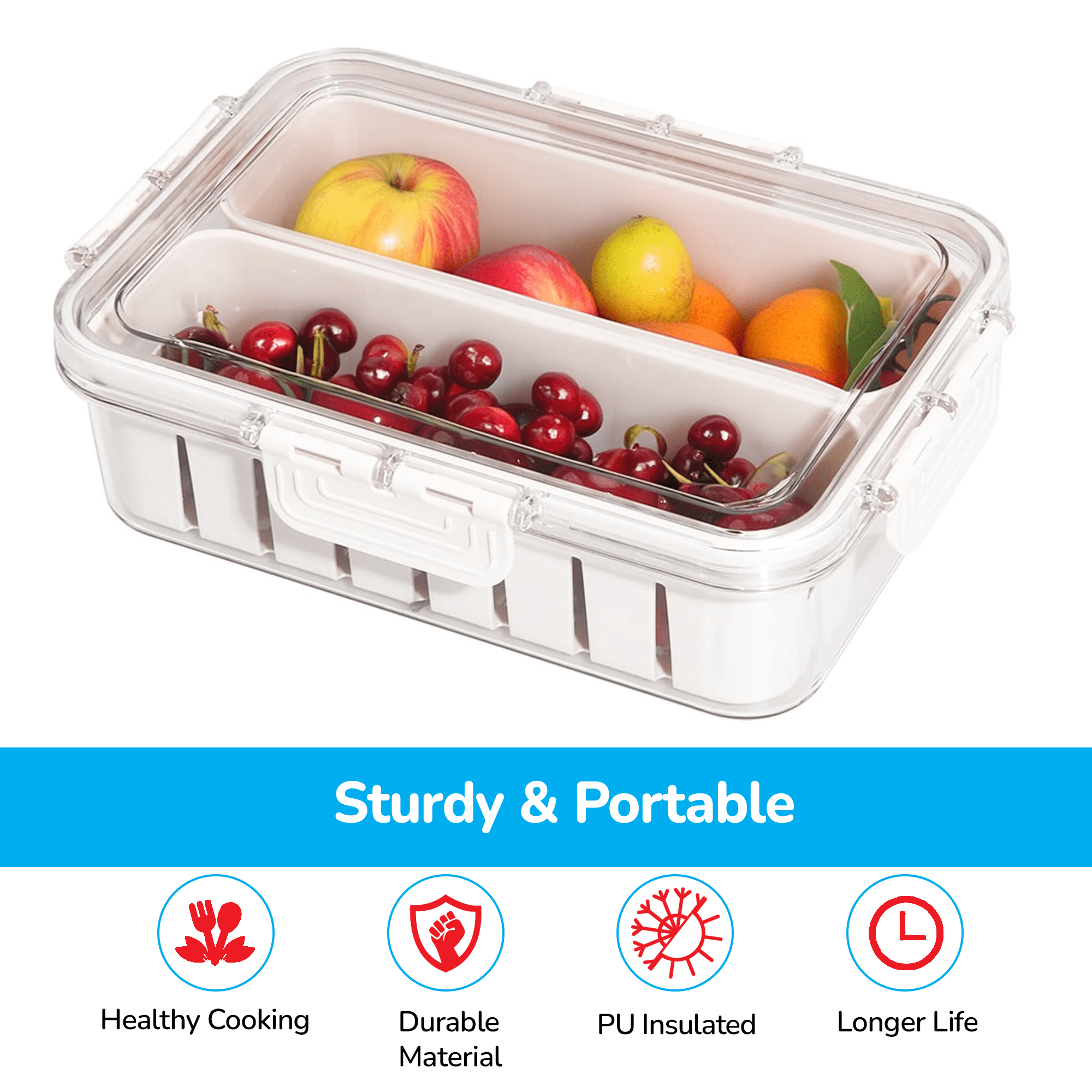 Keep your fruits and vegetables fresh: These multi-functional storage containers feature drain baskets and dated lids, allowing you to quickly drain excess water and extend the shelf life of your fruits and vegetables. 2. Save space and keep fruits fresh: With divided design and multiple compartments, these fruit kitchen storage containers can isolate various foods and prevent odors. They also save space in the fridge or pantry by stacking them neatly on top of each other. 3. Clear Image: With a transparent coating, these fruit kitchen storage containers allow you to see what's inside at a glance, whether it's fruits, vegetables, spices or other ingredients. 4. Space Saving: These fruit kitchen storage containers can be stacked and placed neatly on countertops, in the pantry, in refrigerators or cabinets, making it easy to store and organize your products. 6. Health Safe Materials: The clear kitchen spice box is made of pet PP, providing a safe and healthy food storage solution. 7. Transparent box cover: The transparent cover allows easy visibility, making it convenient to identify the contents at a glance. 8. Organized storage: Spice jars have separate compartments to prevent flavors from mixing and ensure efficient storage of different ingredients. They can also be used for freezing purposes. 9. Easy to Clean: With a detachable design, these containers are easy to clean and maintain, ensuring hassle-free use. Food-grade materials are safe and superior, can store food directly, and are useful for sorting vegetable 2 compartments. Package Included : 1 X Food Storage Container