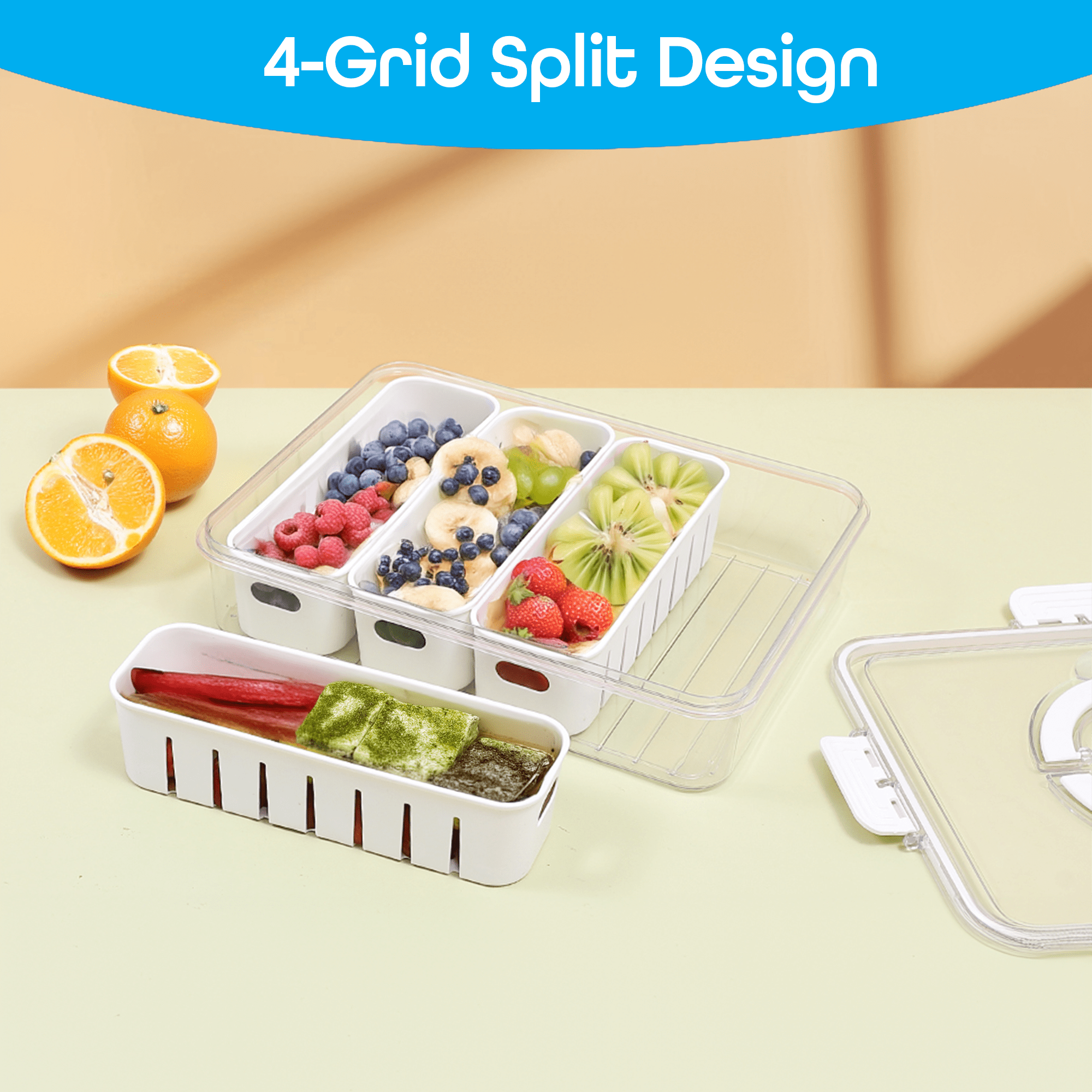 PRIME PICK Refrigerator organizer bins includes 1 large box and 4 compartments, which can be used together or separated. help to maximize your space and keep your refrigerator, freezer, pantry or countertop neatly organized. PET food grade material makes this refrigerator container more durable. reusable food storage containers with detachable sealing lids can effectively resist stains and odors. These removable food storage bins with drainage design, it's prevent soaking of ingredients to help keep the food fresh. Food storage containers with lids make the products fresher. The partition design is used for sorting storage, such as onion, peppers, bean sprouts, and mushroom ideal choice. It can be used for onions, ginger, garlic, dip sauces, spices, baby food, etc.