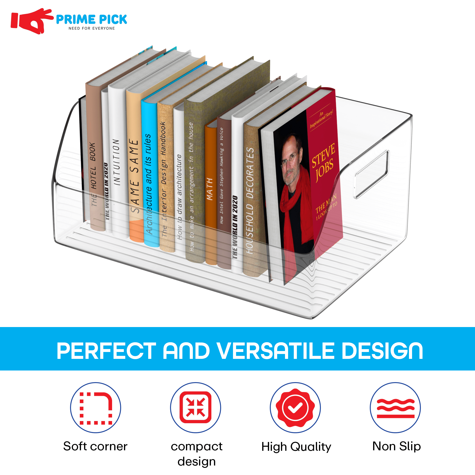 Material: plastic/acrylic. The transparent display case is made of high quality durable plastic which ensures its durability and safety. It can not only display book storage books, but also has two handles which make it very convenient to carry. Widely Used: Side Table Book Storage Kids Book Organizer Portable Book Storage Rack Office File Storage Organizer Box Kids Book Rack Home Desk Organizer Stand Plastic Stackable Box for Home or Office.