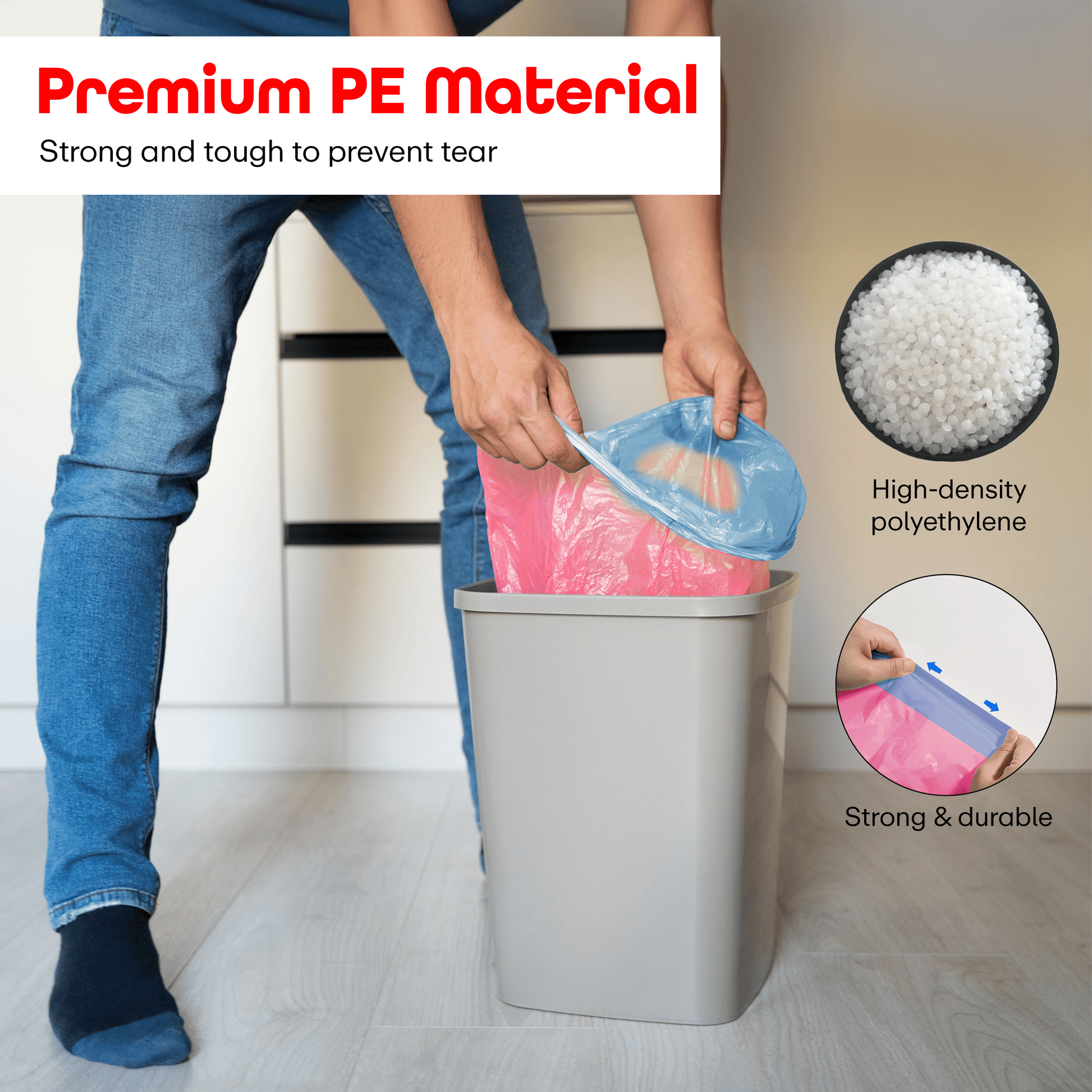 PRACTICAL DESIGN: There is a hole seam at the end of the trash can bag can be easily separated without damaging or tearing various components, its super durable and flexible film has high tensile strength and tensile strength. Resists tears, smells, and prevents unpleasant leaks Efficient garbage bag!