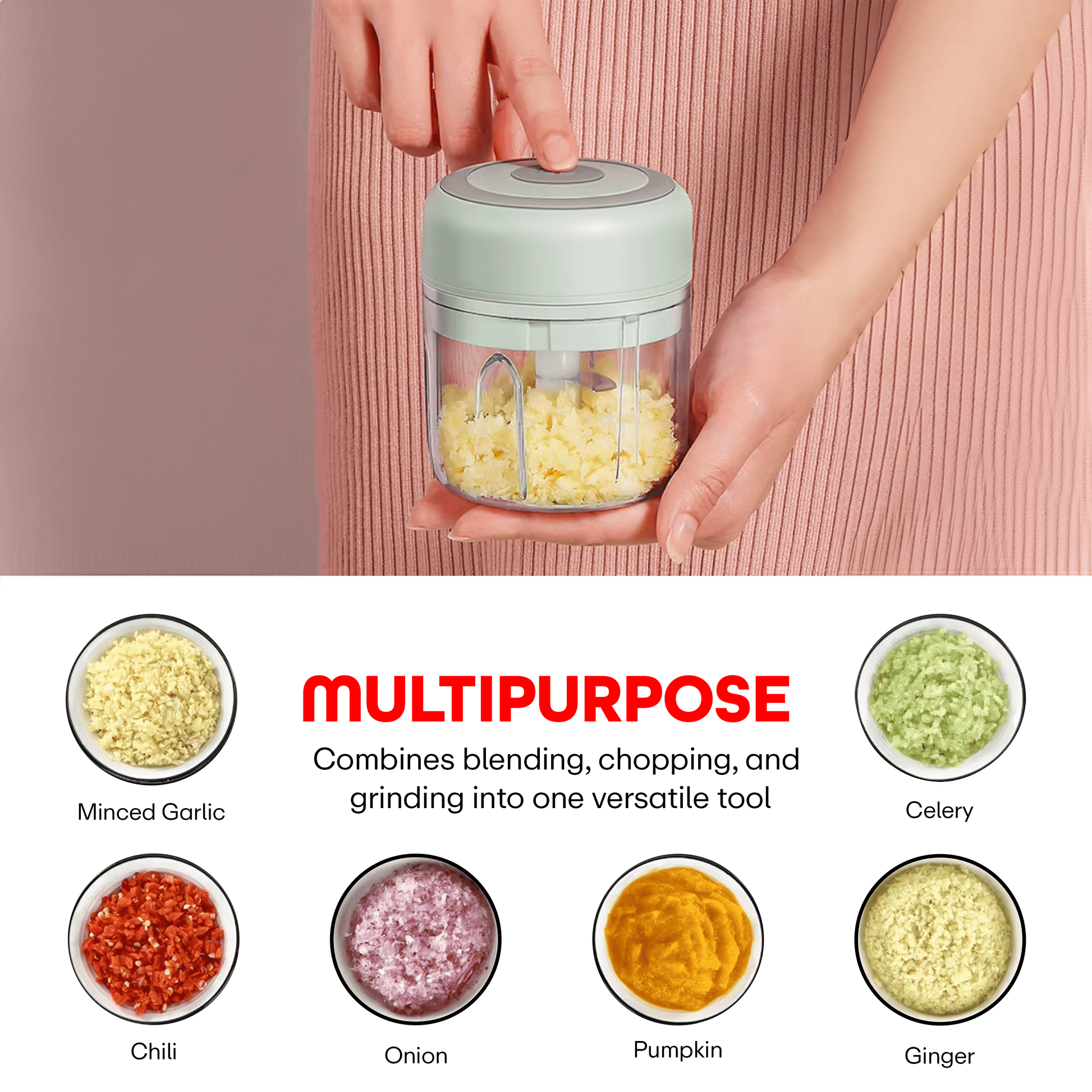 Quickly Chop: The sharp blade of the garlic chopper can quickly chop garlic, seasonings, nuts, vegetables, meat, ice cubes, etc. It is very suitable for small foods. You can use it for cooking, baby food supplement, smoothie drinks.