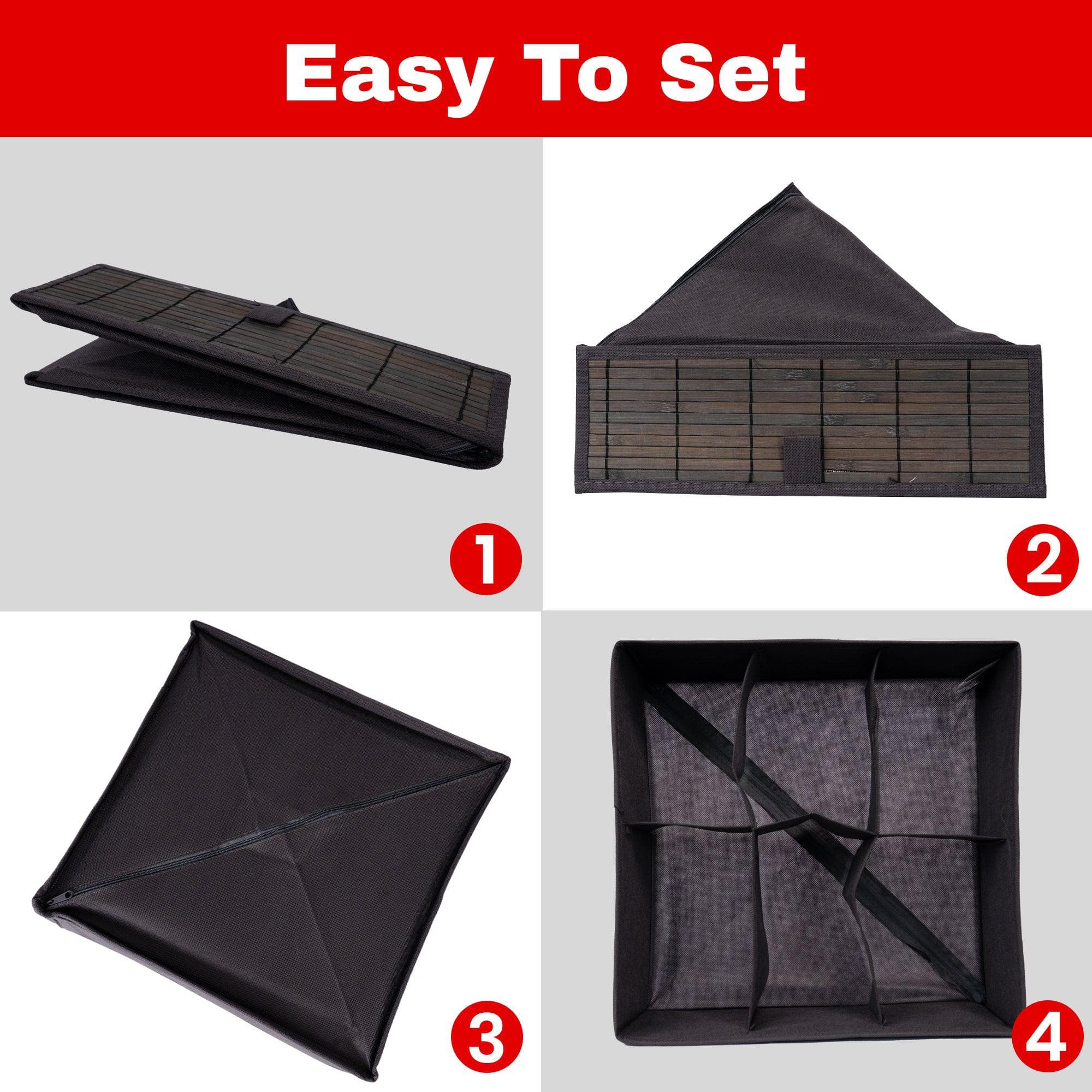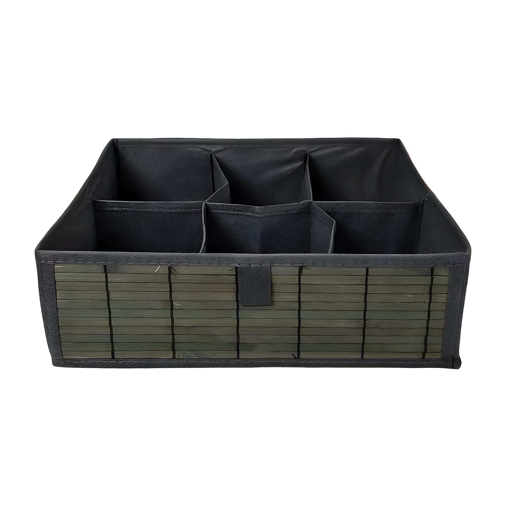 Keep your essentials neatly arranged with this Bamboo Cloth Organizer featuring multiple compartments. Crafted with eco-friendly bamboo and strong fabric, it is perfect for sorting clothes, socks, undergarments, ties, and accessories. Its compact dimensions (33cm x 12cm x 2.5cm) make it an ideal space-saving solution for wardrobes and drawers.