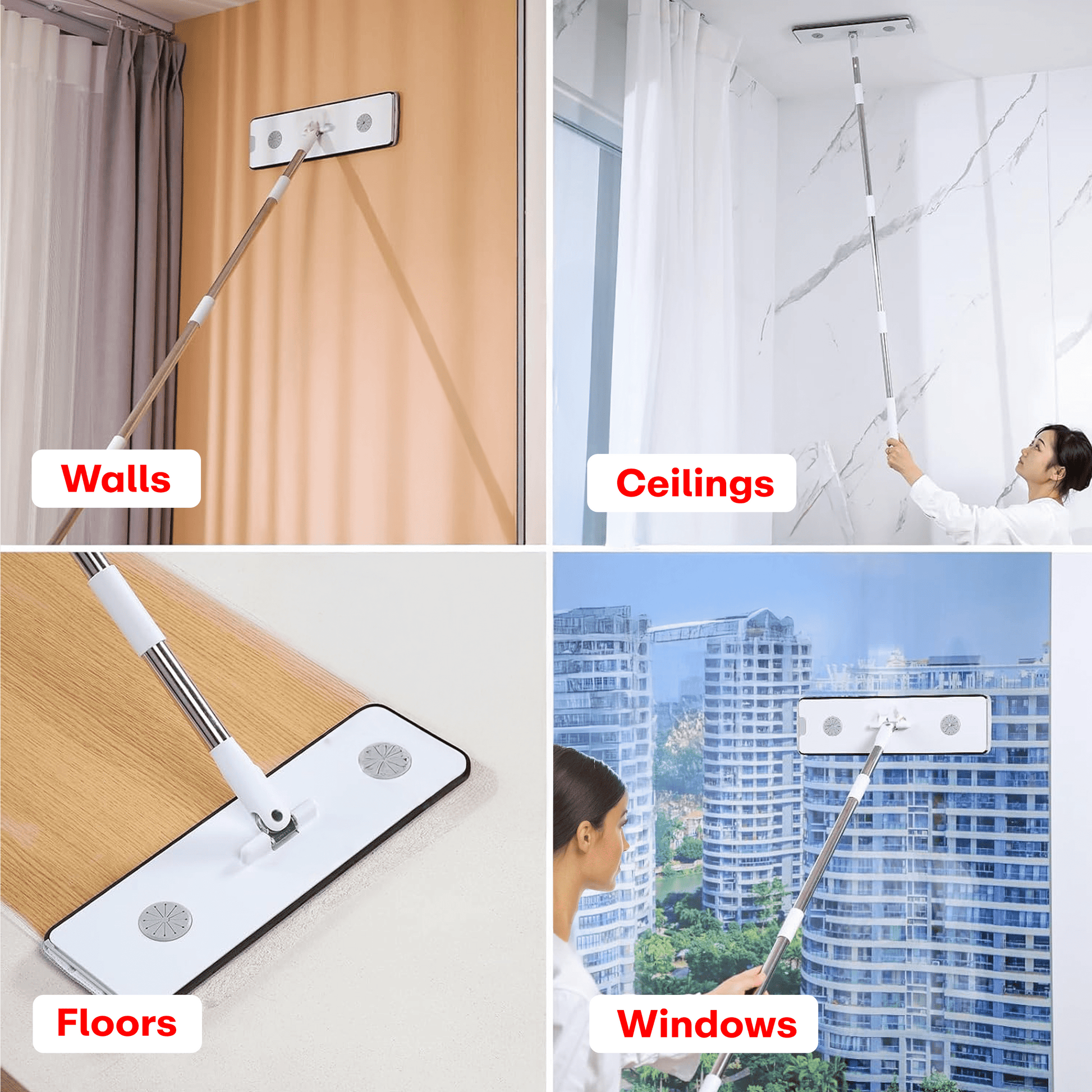 MULTI-SCENARIO USE - This self-twisting mop is suitable for all types of hard floors, such as wood, marble, laminate, tile, vinyl, resin, etc. It can also be used to clean windows, walls, ceilings, glass, etc.