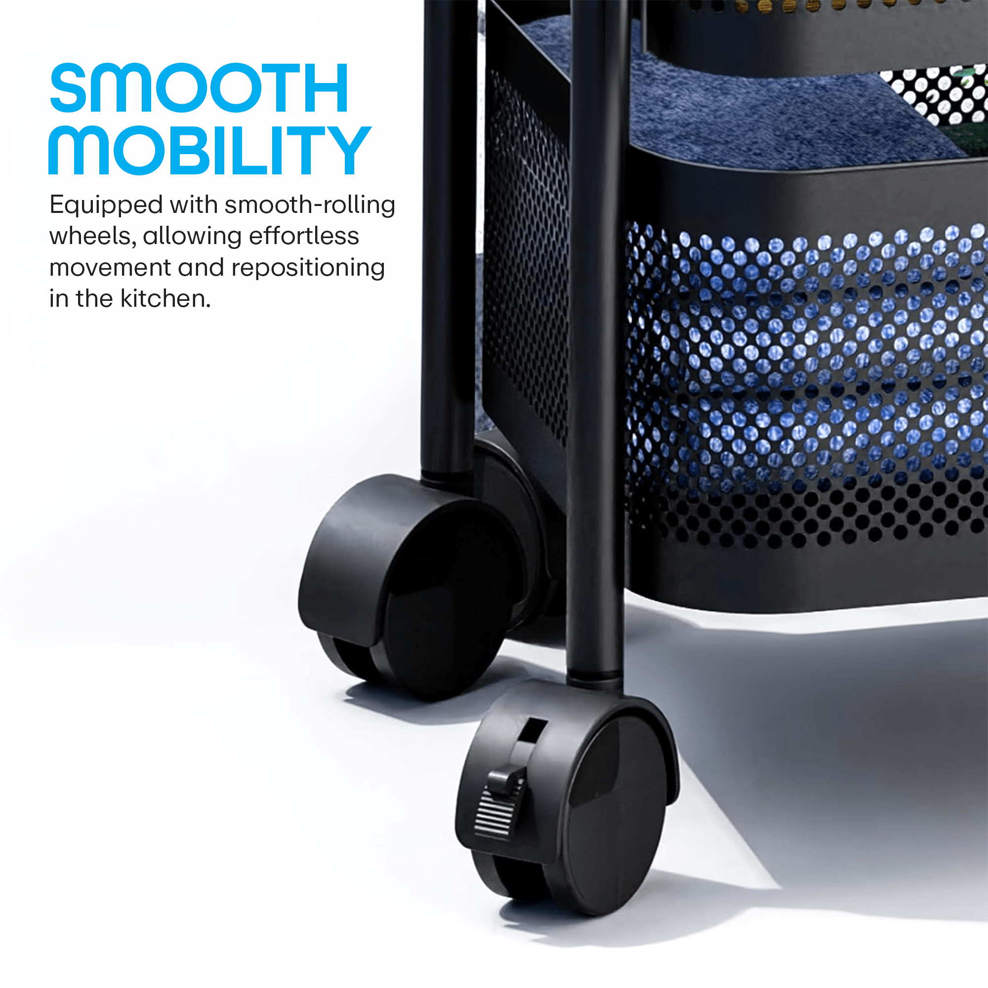 PRIME PICK rotating storage rack for kitchen will meet your storage needs, and keeps your room neat and clean. The storage rack assemble already, just need to install wheels. The upgraded 5 wheels design strengthen the stability and armrest allows easily and smoothly move anywhere. The guardrail on the top of the plate can protect the small items from sliding down. Each basket of the storage shelf can be rotated to facilitate storage and taking of items and save space. The rolling cart also paired with lockable wheels and magnetic buckles, which bring you great convenience during use. You can feel free to move it without warring about the baskets would shaken during moving. The movable design make corner cleaning easier. With encrypted metal mesh design, the baskets have high air permeability for keeping fruits and vegetables fresh. The basket can be detached, more convenient to use, clean and store, the rotating floor-standing shelf is sturdy and not easily deformed. Versatile used in kitchen, living room, bathroom, bedroom, laundry room, toy room, office. Organizes your fruits, vegetables, snacks, toys, and ect. well. It's easier and more efficient to keeps your space organized and tity.