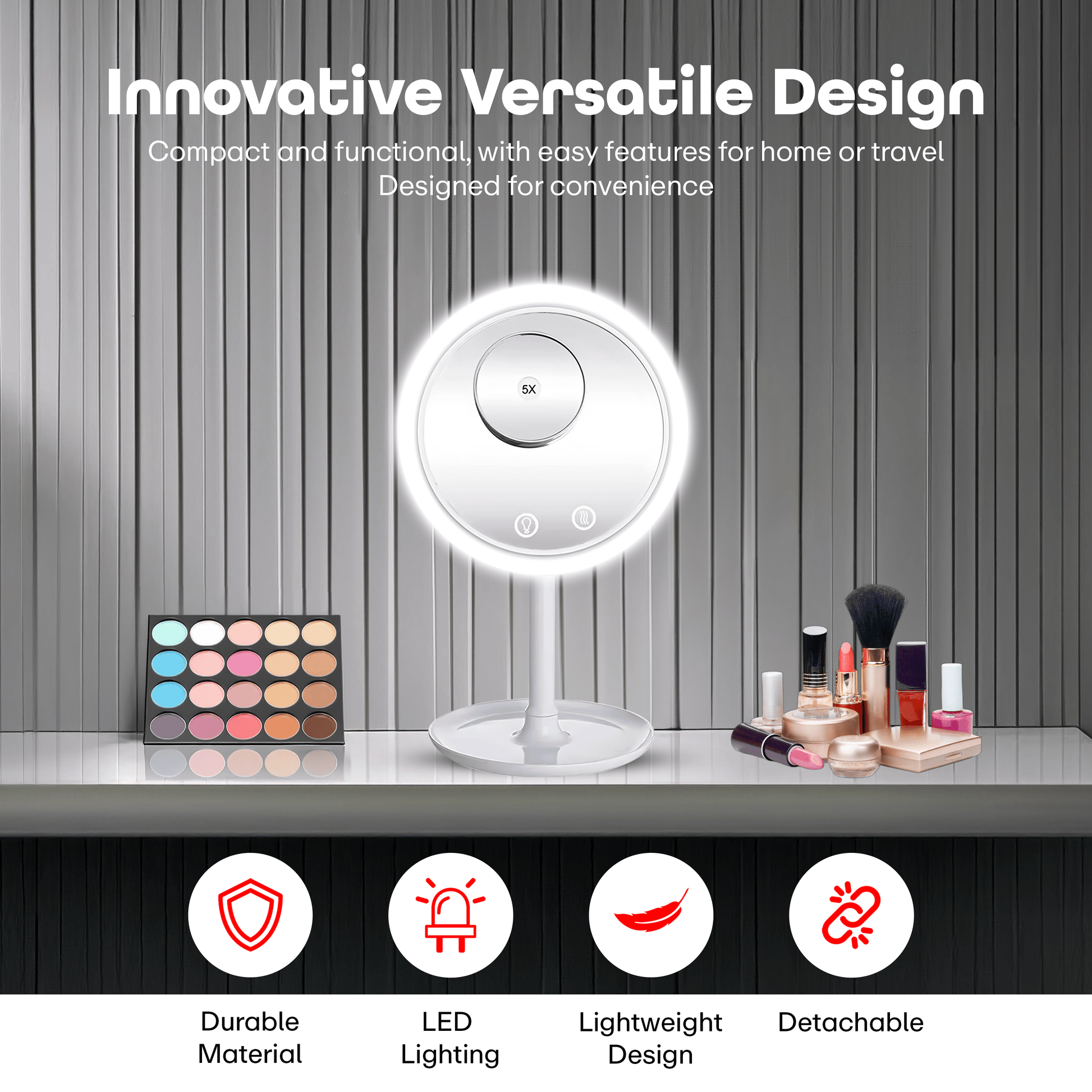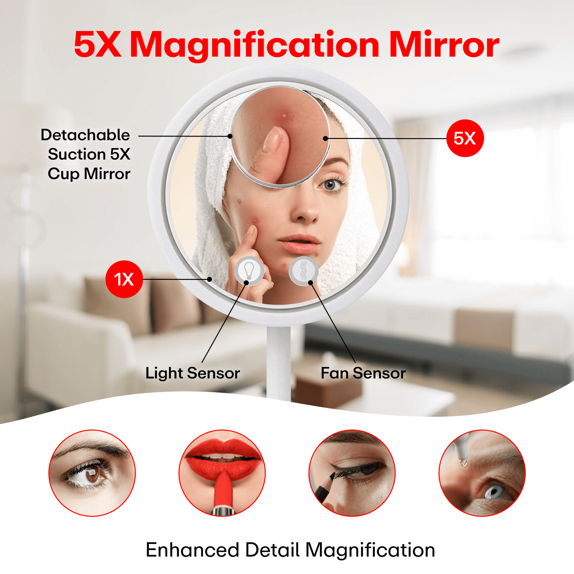 5X MAGNIFICATION & HIGH DEFINITION EFFECT - Powerful integrated 5X Magnification detachable suction cup mirror. Using the optical principle of No Pixels Loss Magnification which can guarantee real HD effect. Clearly focus on facial details, such as eyelashes, acne, etc...
