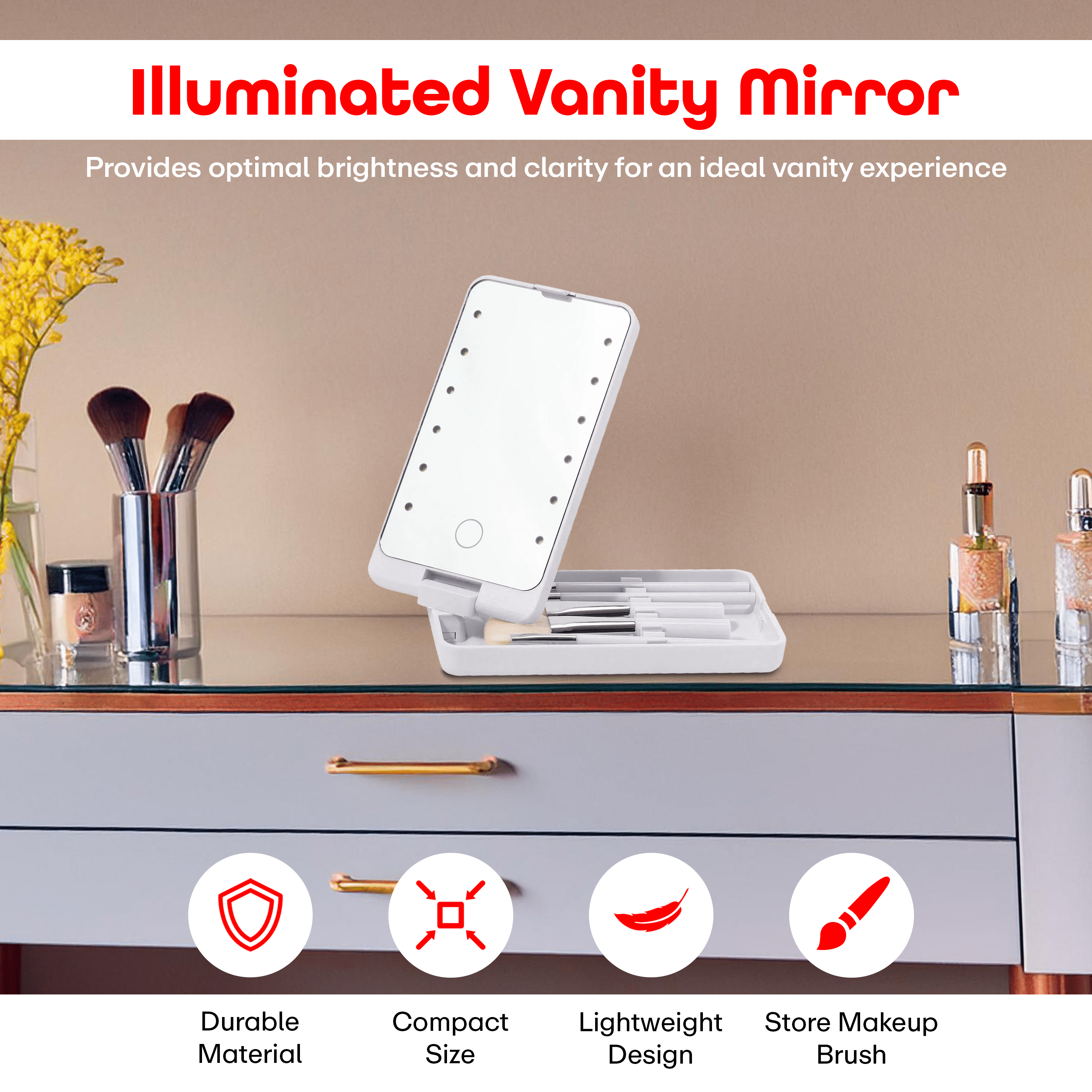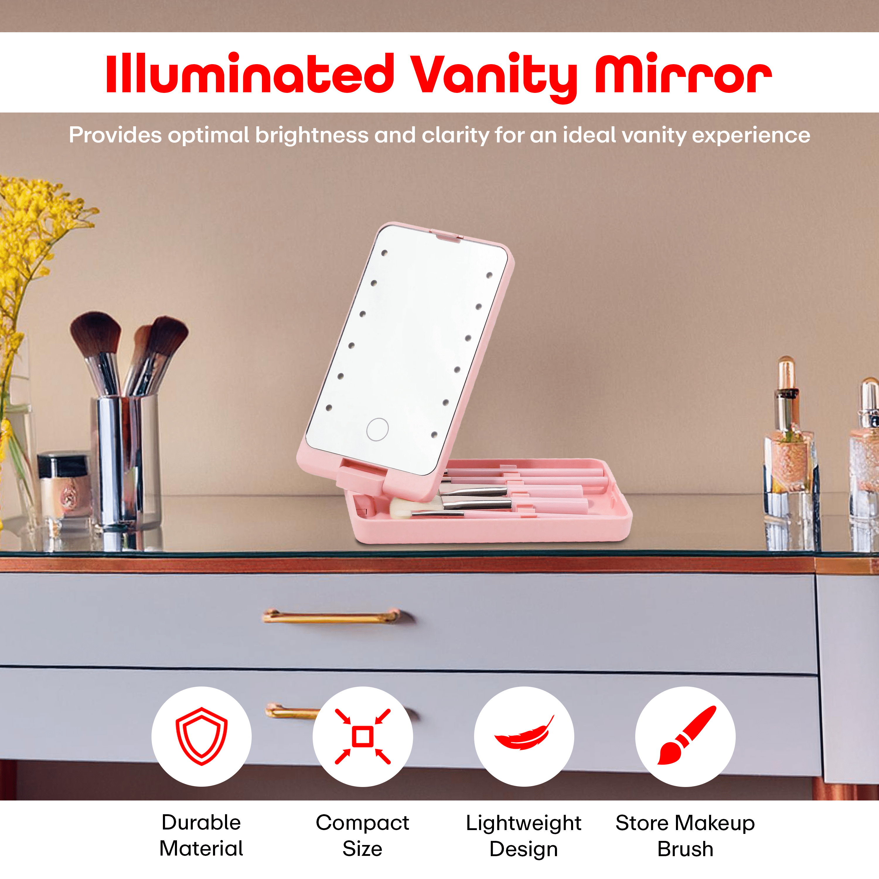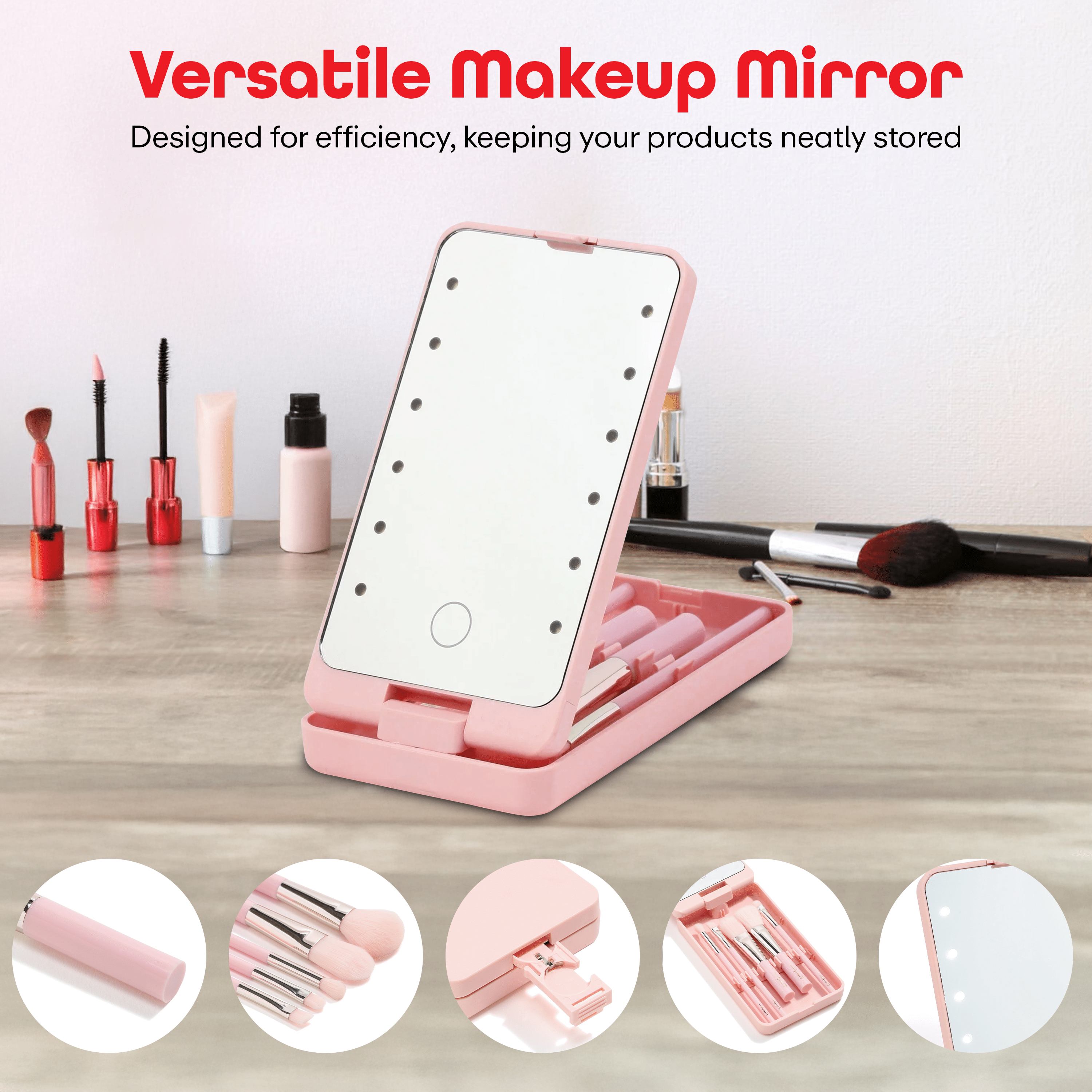 2 IN 1 MOBILE DRESSING TABLE: This upgrade travel makeup vanity mirror offers more than a mirror and light, but also combines the function of makeup brush storage . With the flip on design, the stylish and functional cosmetic vantity mirror, after opening, you will see a hidden makeup brush storage beneath the mirror. This vanity mirror is bringing more convenience for your makeup routines.