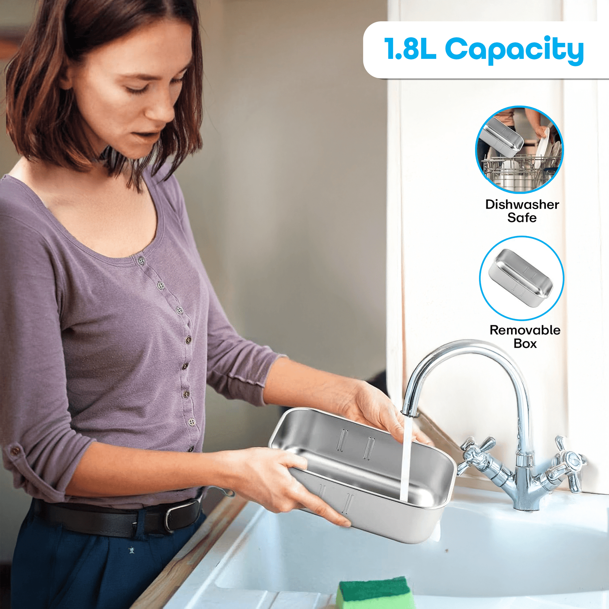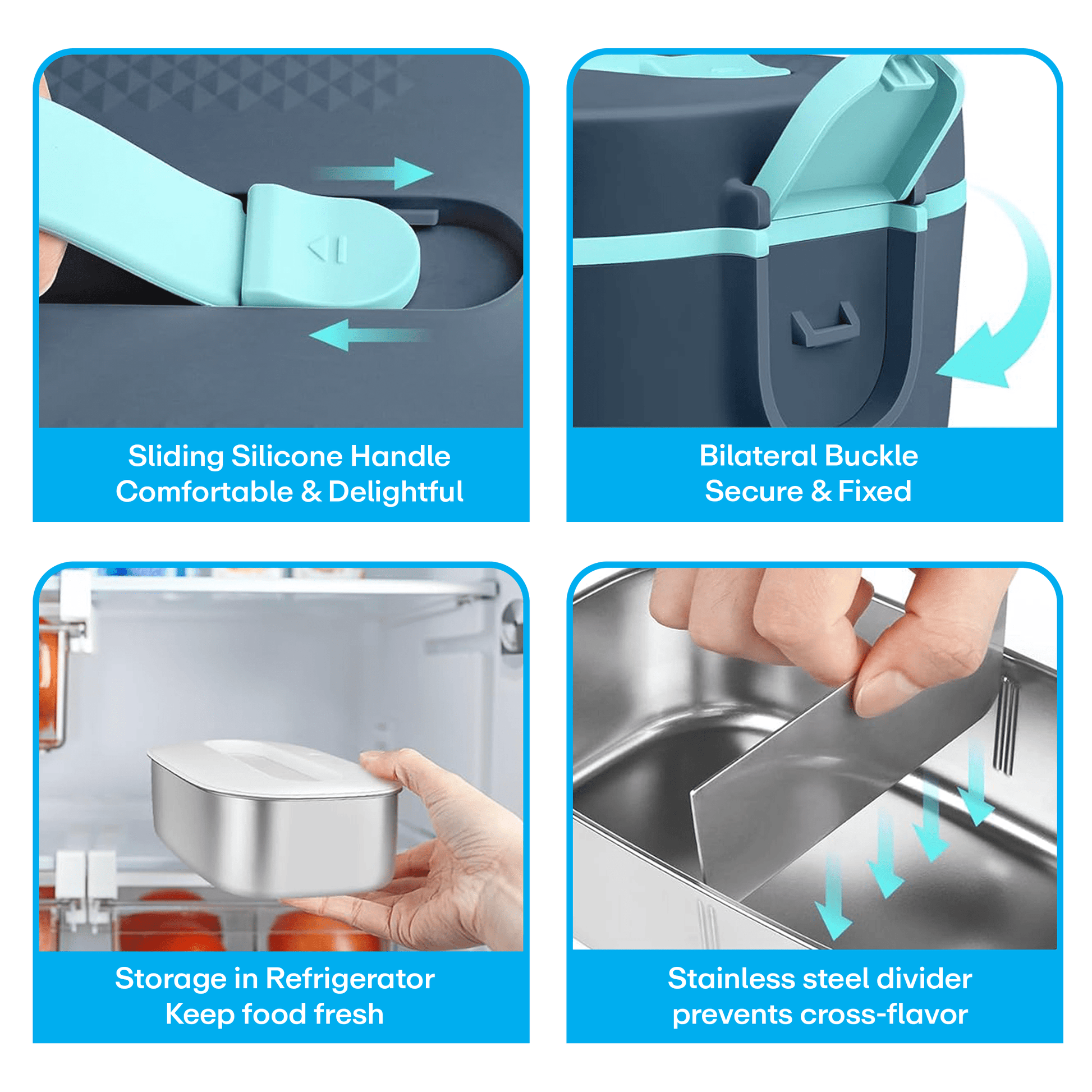 𝐊𝐄𝐄𝐏 𝐅𝐑𝐄𝐒𝐇 & 𝐈𝐍𝐒𝐔𝐋𝐀𝐓𝐄𝐃 - The superior quality of 304 stainless steel container with a detachable divider so ensures that your food does not cross taste. A white sealing cover contains that the leftovers can be stored directly in the refrigerator to keep food fresh.