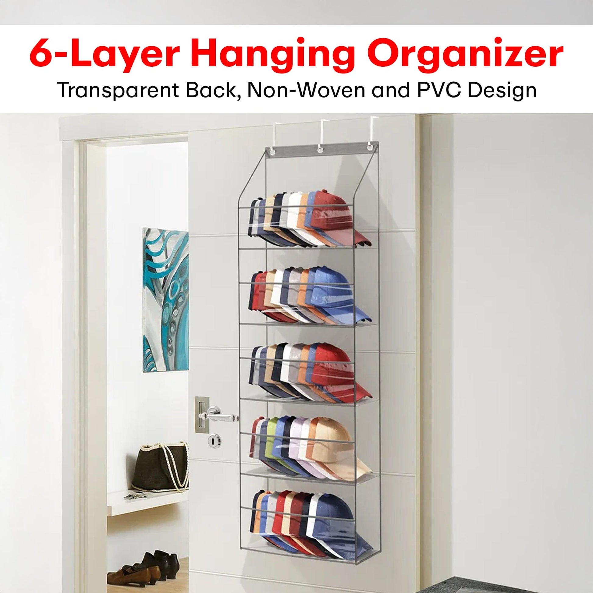 Keep your essentials organized and within reach with the Prime Pick 6-Layer Back Door Hanging Organizer! Designed with a transparent front, this space-saving organizer lets you quickly find your shoes, accessories, or household items. It hangs effortlessly over any standard door, making it perfect for bedrooms, closets, dorms, or small apartments. Crafted with durable, dustproof material, it keeps your items clean and tidy while saving space!
