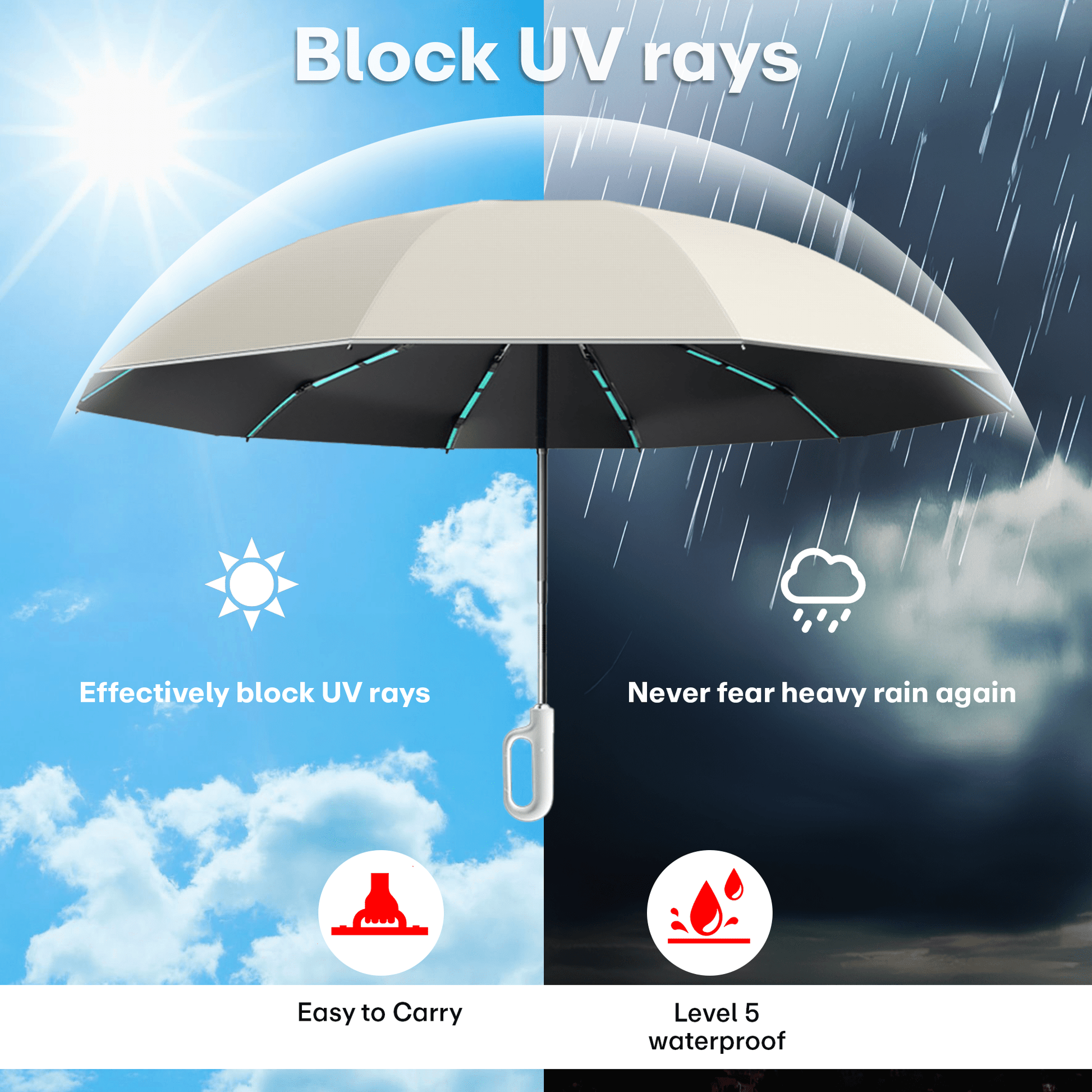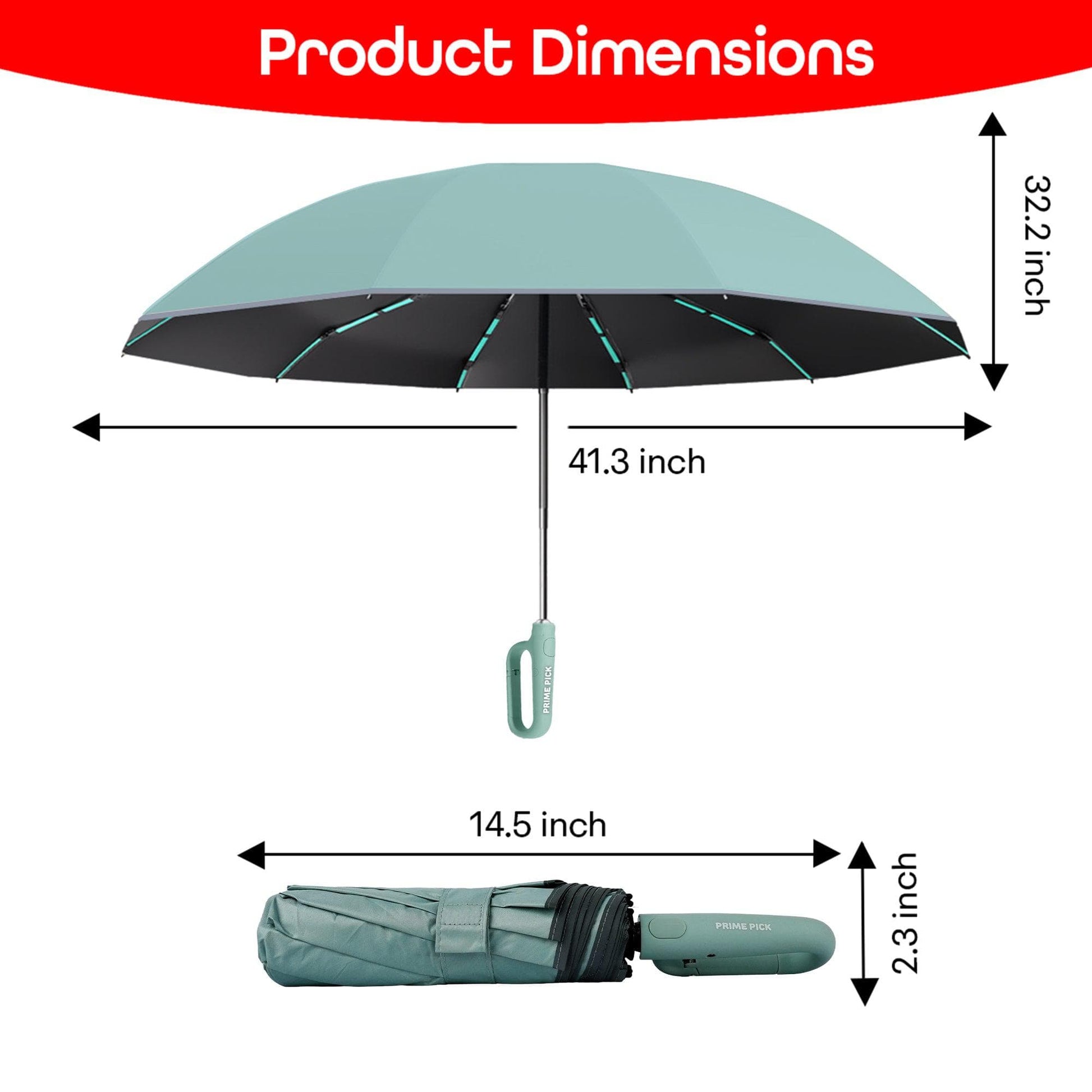 Prime Pick = UV Protection, Made with polyester or similar fabric that provides UV protection, 95% UV blocking or SPF coverage. This feature helps shield you from harmful sun rays. Anti-Slip Handle: Ensures a secure grip even in wet conditions, enhancing usability during both rain and sunny weather
