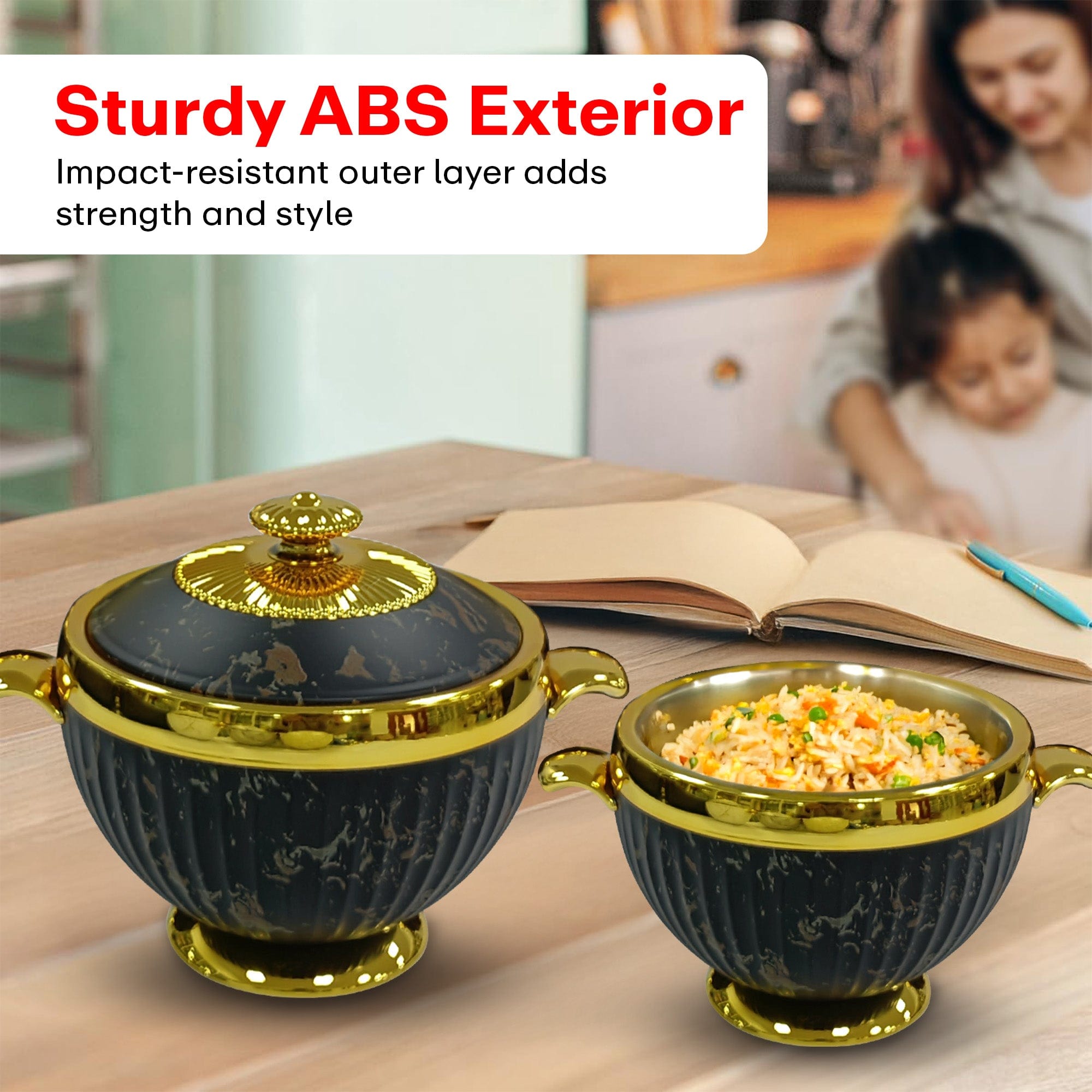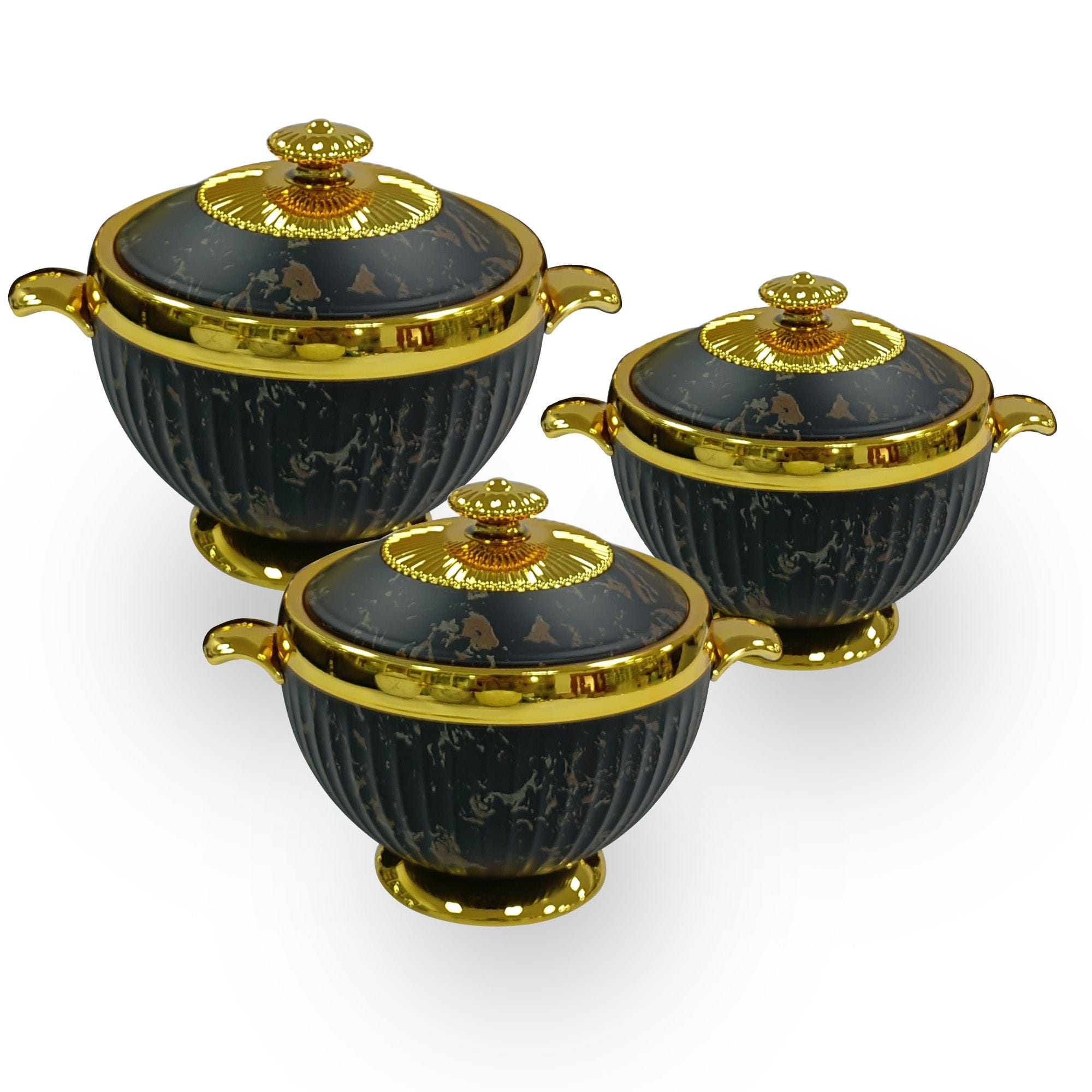 Add a royal touch to your dining table with this exquisite Gold & Black Marble Casserole Set of 3, featuring a luxurious marble pattern and brilliant gold detailing. Designed for both function and presentation, this casserole set keeps your food warm and stylishly served. With capacities of 1.2L, 1.8L, and 3.2L, it’s perfect for serving a range of dishes – from rice and curries to gravies and stews – during everyday meals or festive feasts.