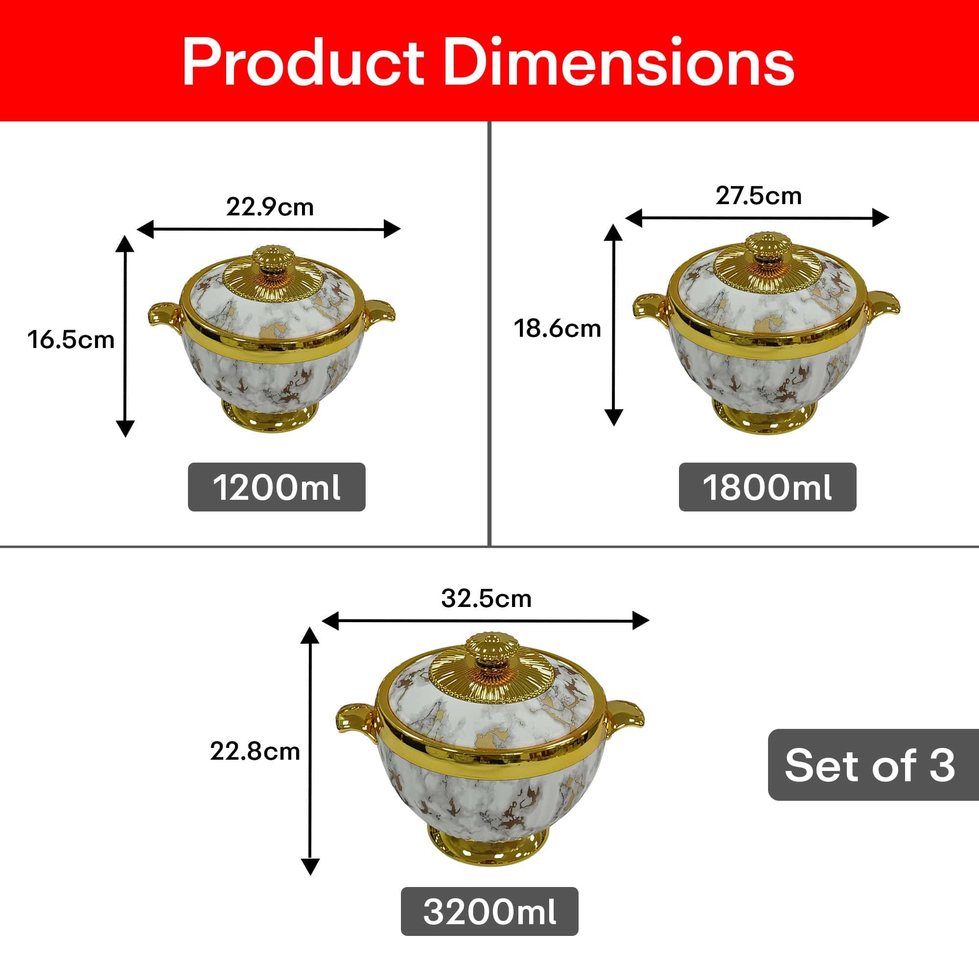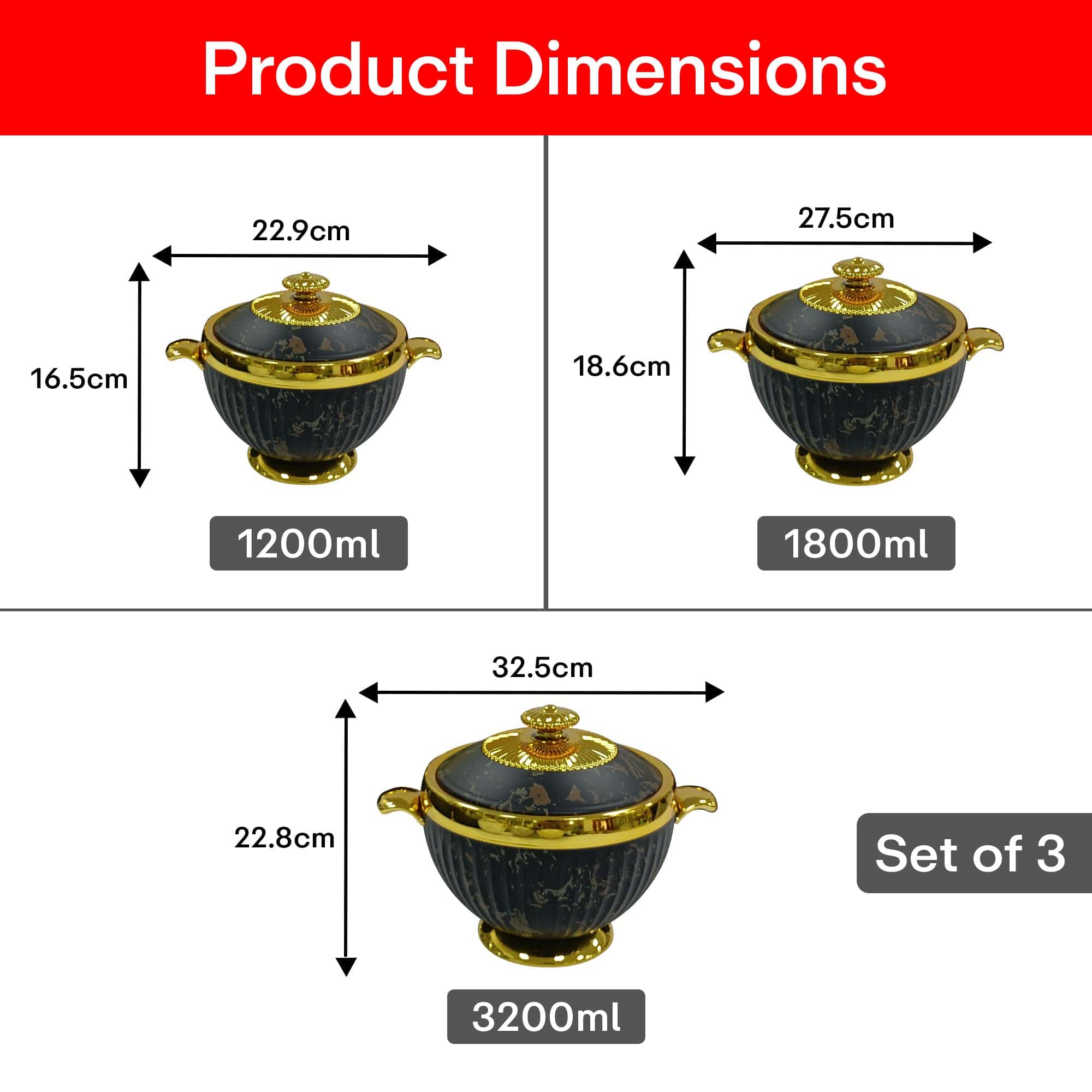 Premium Set of 3: Includes 1.2L, 1.8L, and 3.2L casseroles to suit various serving needs