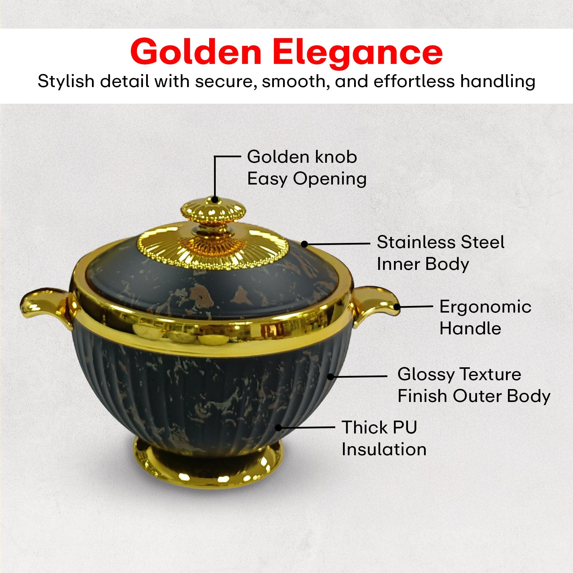 Golden Handles & Lids: Beautifully crafted handles and knobs for easy, elegant serving