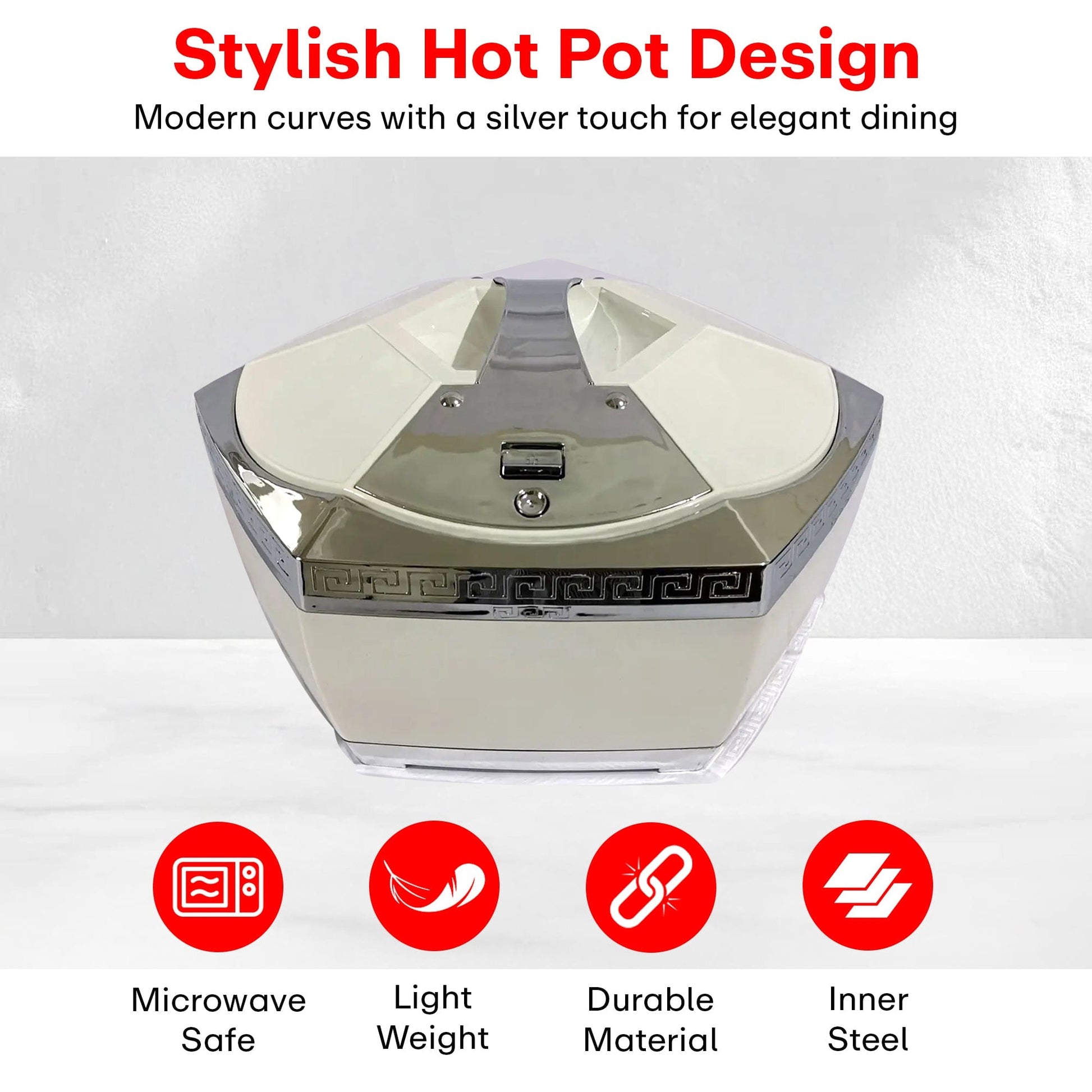 Elevate your dining experience with the Luxury Hexa Casserole 5L – a premium insulated hot pot designed for both style and functionality. With its sleek silver and ivory finish, this 5-liter casserole keeps food hot and fresh for hours. Ideal for family dinners, special occasions, and festive gatherings, it combines elegance with durability. Its geometric design and chrome detailing add a touch of sophistication to any table setting.