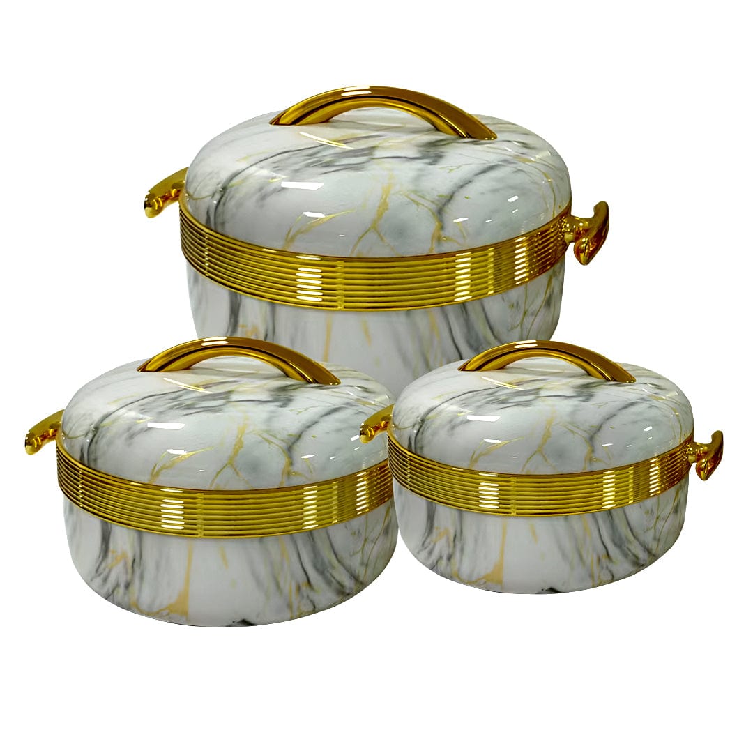 Add elegance and functionality to your kitchen with this stunning 3-piece insulated casserole set, featuring a premium white marble finish accented with luxurious gold handles and bands. Designed to keep food hot or cold for extended periods, this set is perfect for serving at family dinners, celebrations, and special occasions. Includes 1L, 2L, and 3.5L capacities to suit all your serving needs.