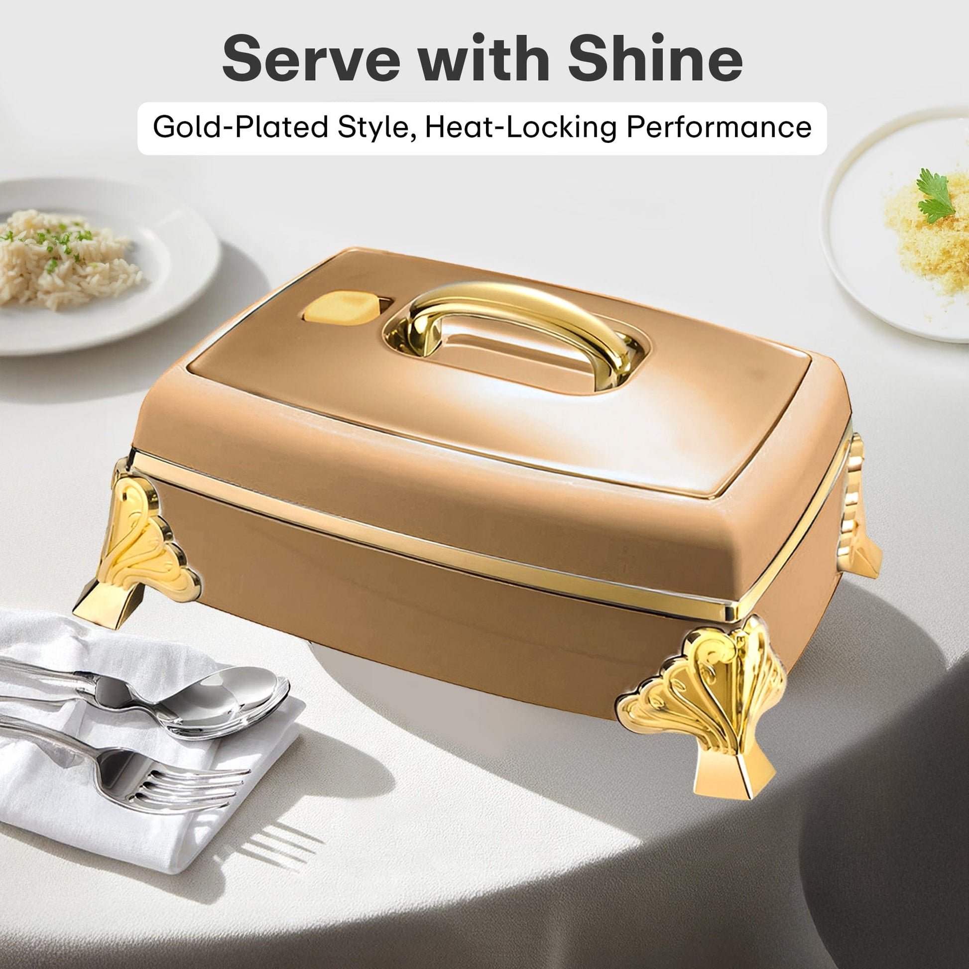 Add a touch of elegance to your dining table with the PP-475 Rectangular 5.5L Casserole. Designed for modern homes and grand gatherings, this insulated hot pot features a stylish matte copper finish with gold-toned legs and a sturdy handle. Ideal for serving biryani, curries, or pasta while keeping... Read more