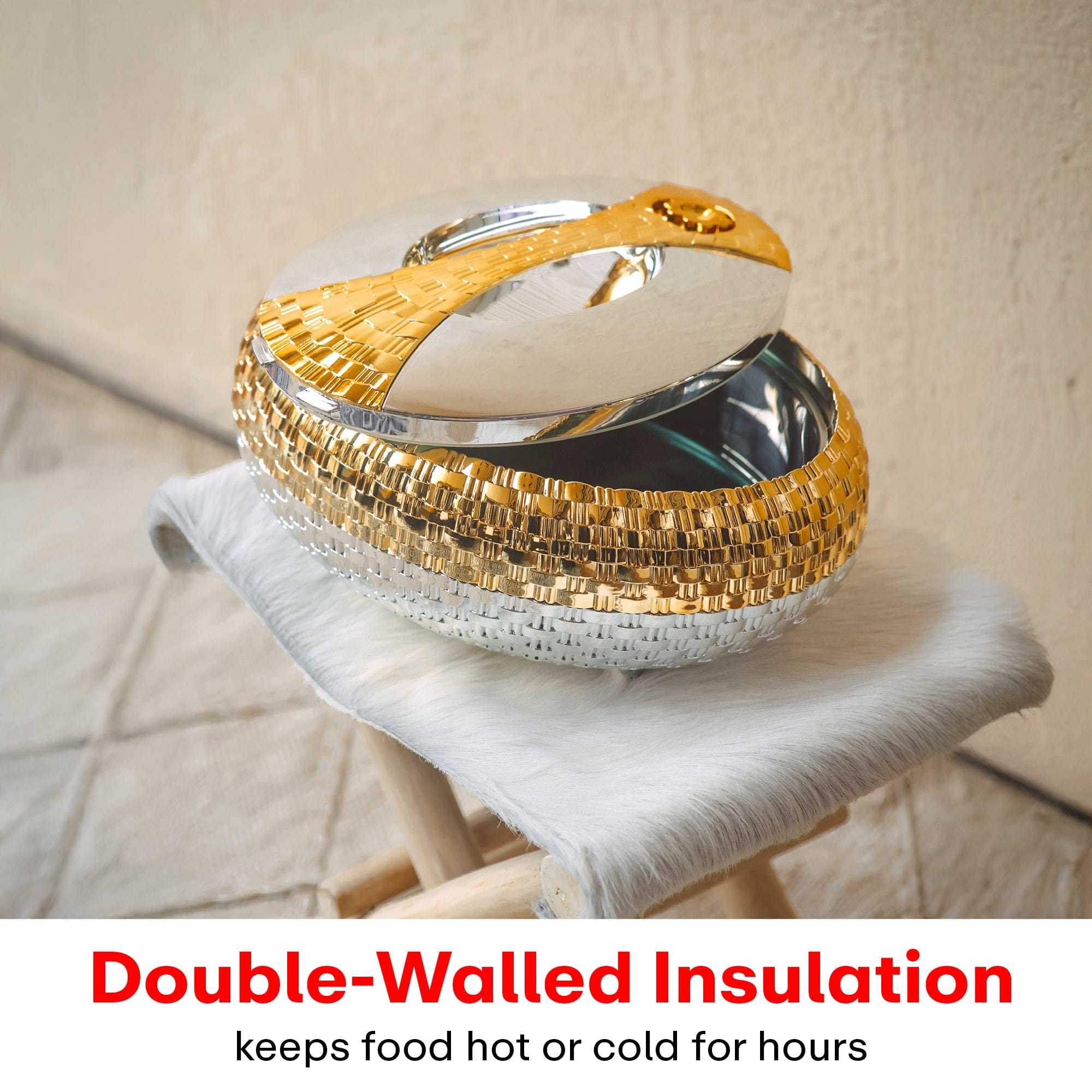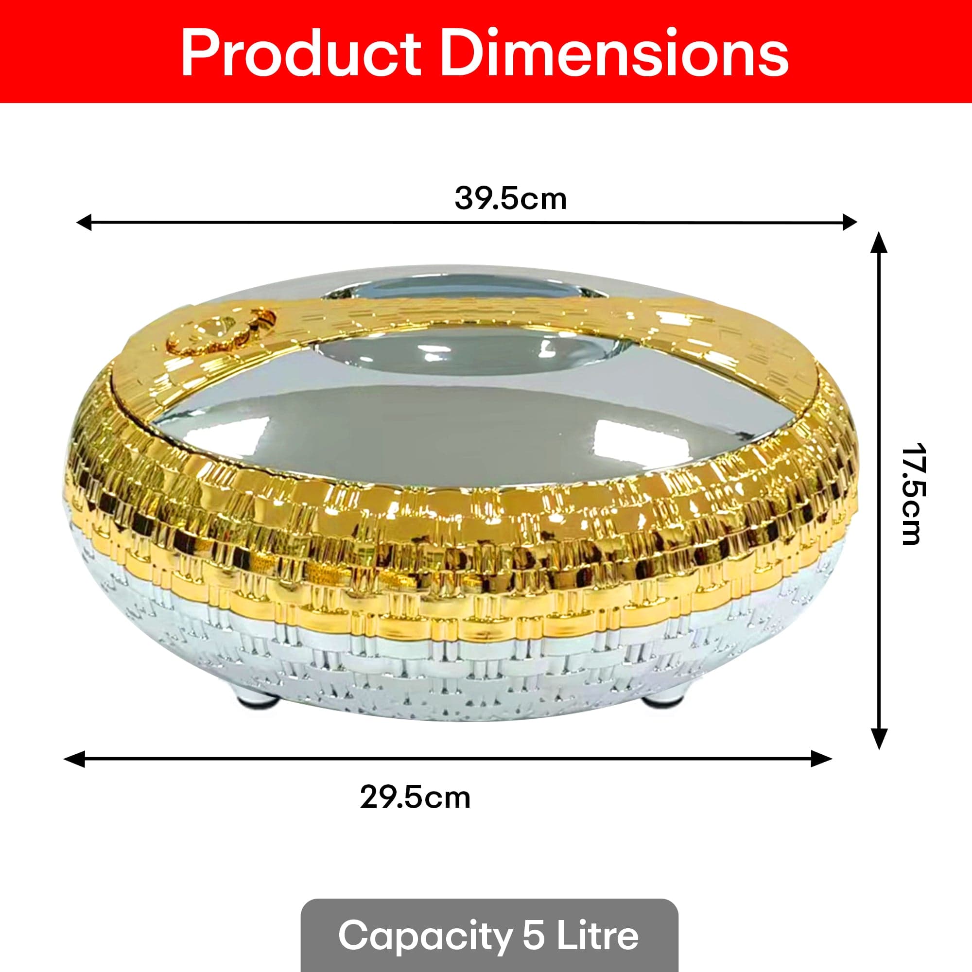 Elevate your dining experience with this Premium 5L Silver & Gold Round Casserole, a perfect blend of elegance and functionality. Designed to keep your food hot and fresh for hours, this stylish hot pot is ideal for family meals, festive gatherings, and dinner parties. Its eye-catching metallic finish adds a luxurious touch to your table setting, while the insulated body ensures optimum temperature retention.