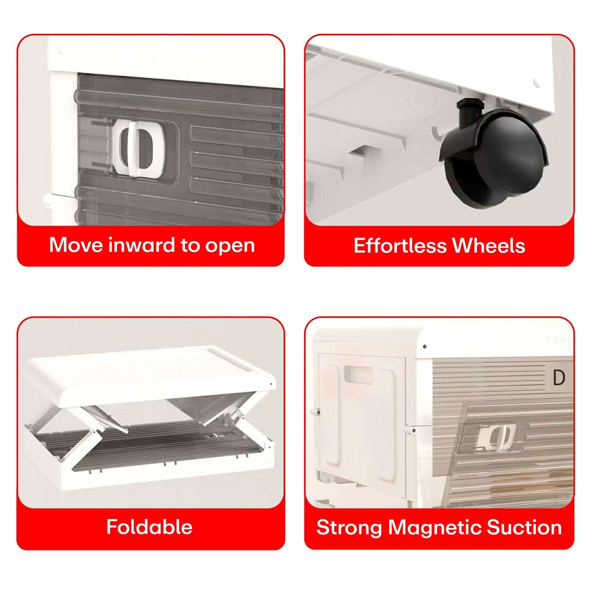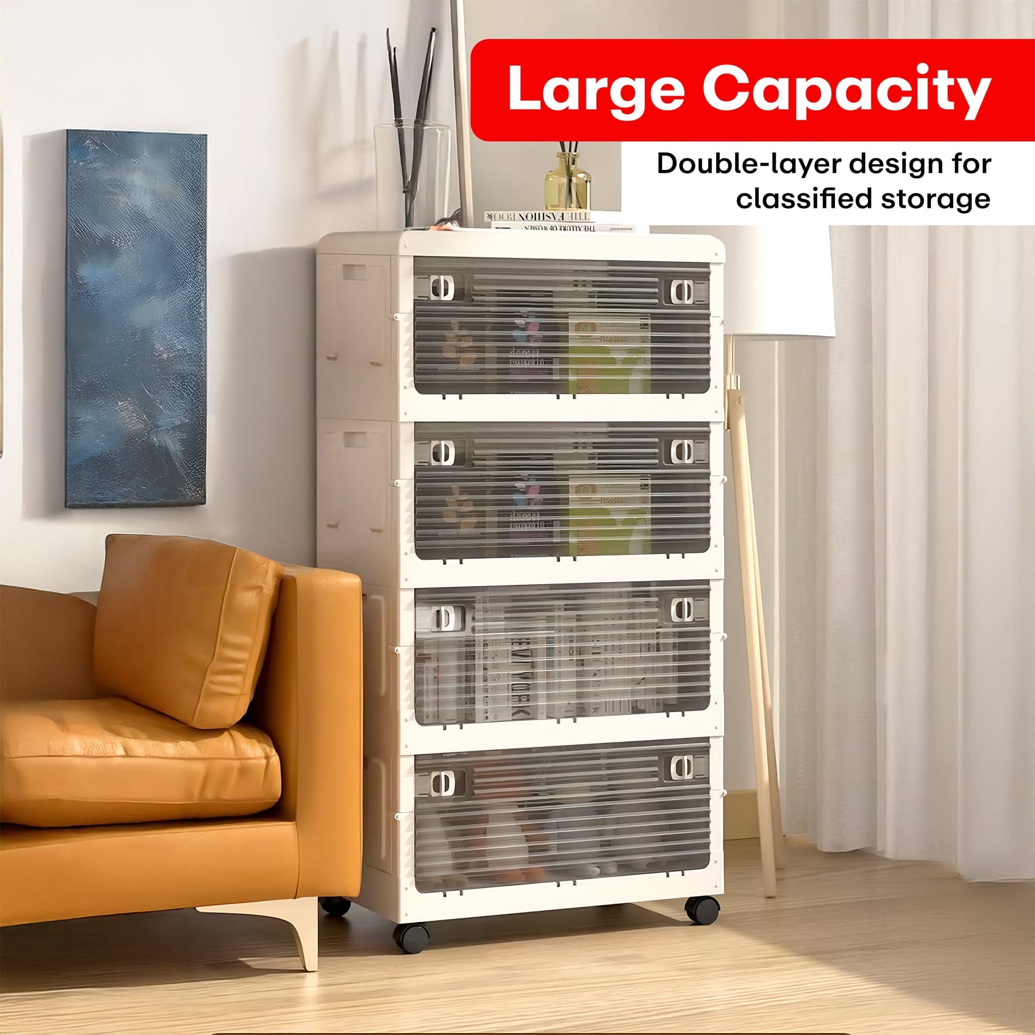 【Durable and sturdy ]This collapsible storage bins with wheels is made of PP upgraded processing, with a hard and sturdy outer shell and strong load-bearing capacity. The semi transparent cabinet door design allows for easy identification of internal items, which not only helps you save time and maintain efficiency, but also prevents items from accumulating dust