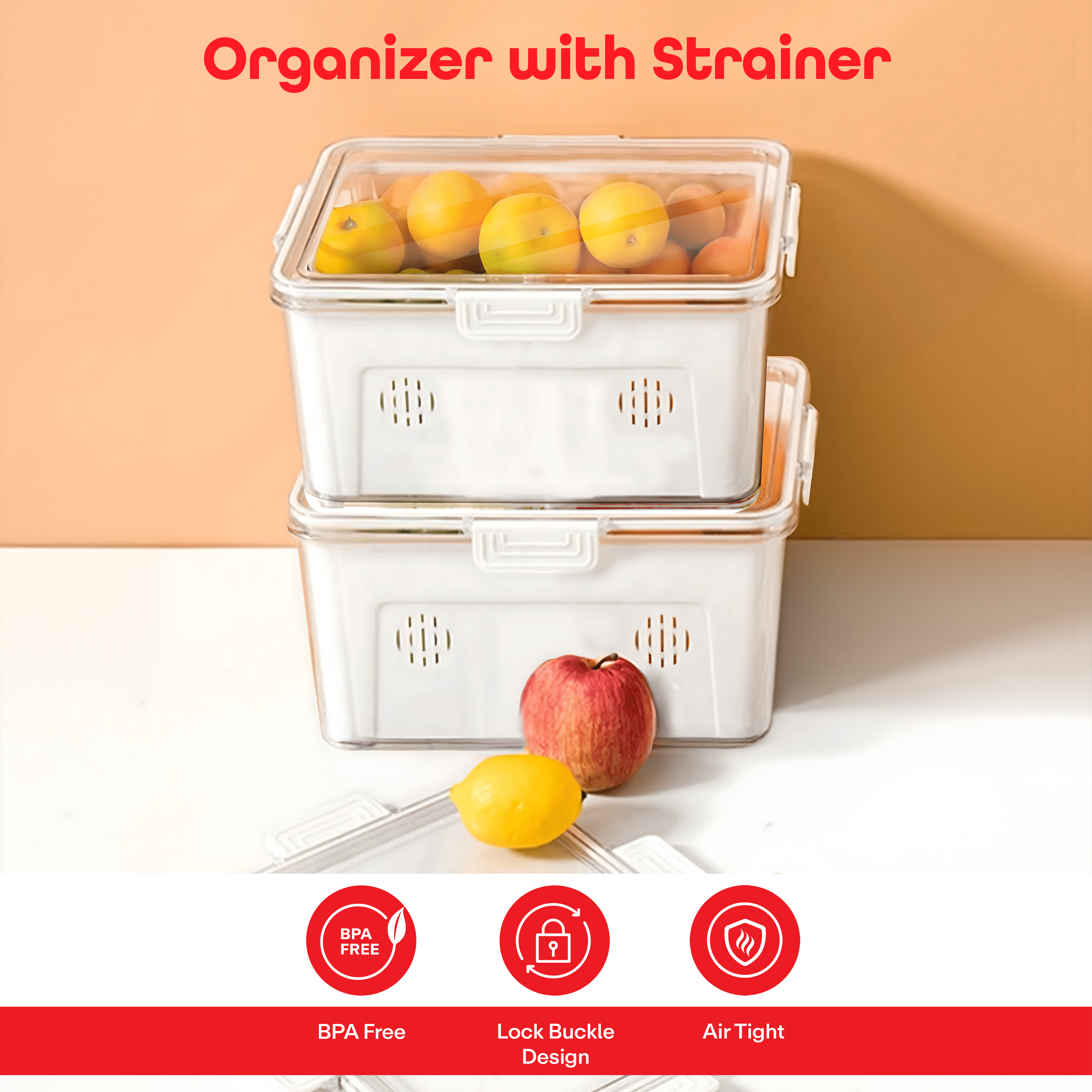 PRIME PICK Strainer Organiser is Crafted from premium food-grade material, these bins are not only durable but also resistant to stains and odors. Cleaning is a breeze with just soap and warm water, ensuring your food remains fresh and safe. Inside each refrigerator storage box, you'll find divided drain baskets. This means you can use them as storage bins in the fridge or as colanders over the sink to wash produce. After washing, simply place the bin in the fridge, eliminating unnecessary hassle. Keeping your refrigerator organized has never been easier. These containers come with lids, allowing for easy stacking and preventing food from getting lost in drawers or awkwardly piled on shelves.The transparent design lets you see what's inside at all times, and the secure lid seals in freshness.