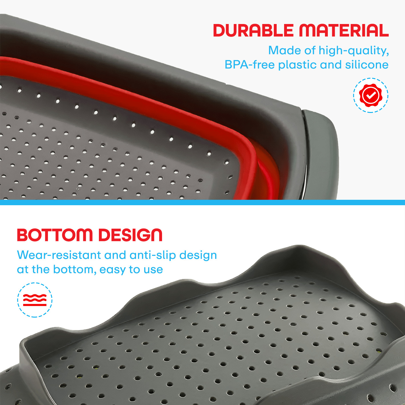 Sturdy Design and Premium Quality - You can rest assured that you’re getting only the very best with silicone collapsible colander. The strainer’s convenient and ergonomic design will make cooking easier than ever as it has non-slip handles for perfect stability.