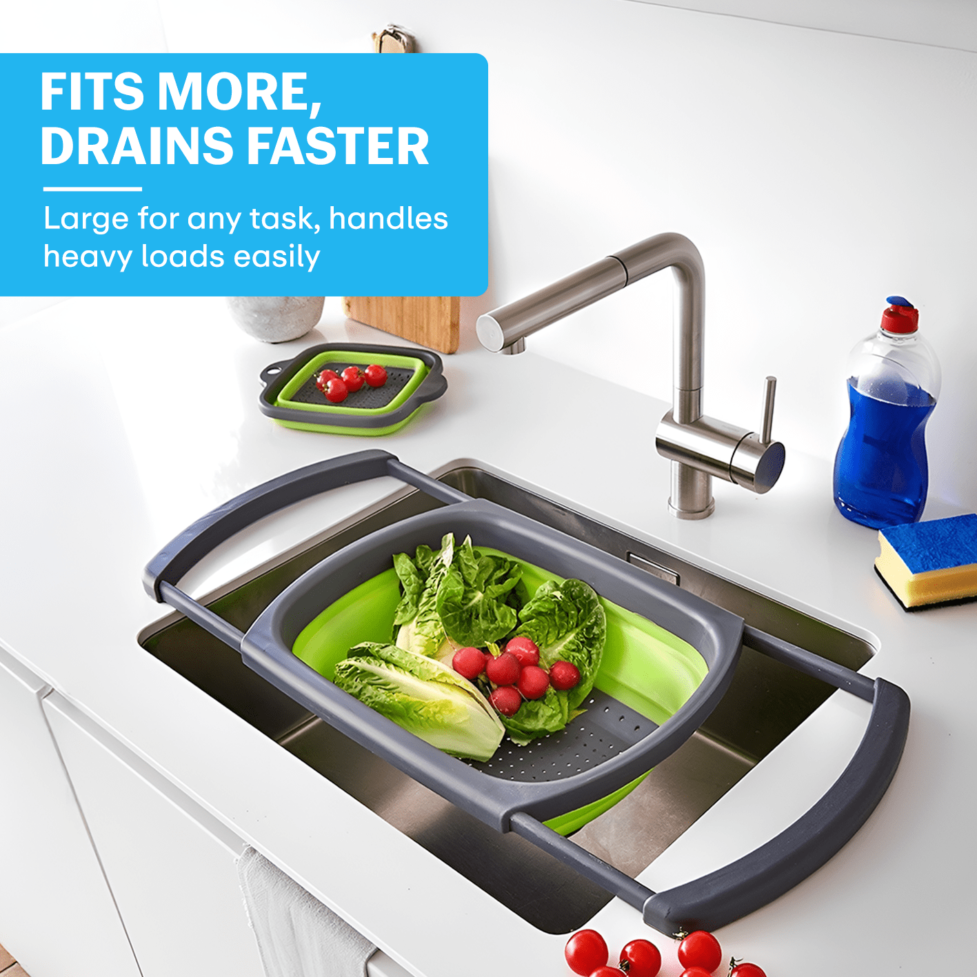 Multipurpose Food Strainer with extendable handles – Ideal for pasta, fruits, veggies, and meats, this over the sink colander with extendable handles makes it easier to drain excess water, oils, or unhealthy fats away.